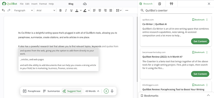 Its Co-Writer is a much more delightful and powerful writing space than Google Docs, where you can use all of QuillBot’s tools in one place, which speeds up your writing.