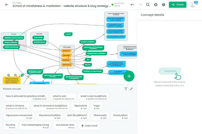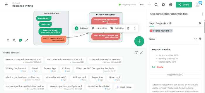 The best part about this tool is that it generates keyword ideas in real time based on the topics you add to your whiteboard. You’ll find keyword metrics, SERP results, and short AI-generated paragraphs. You can pin these resources as notes to do further research and flesh out your mindmap.